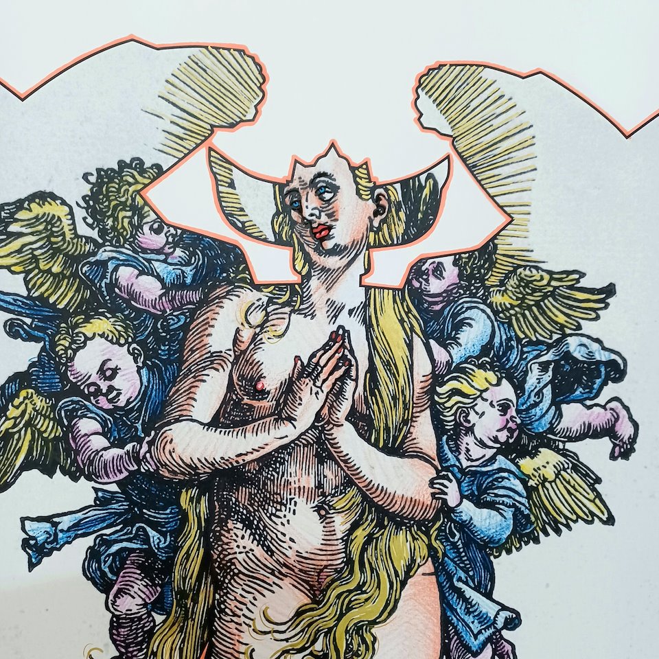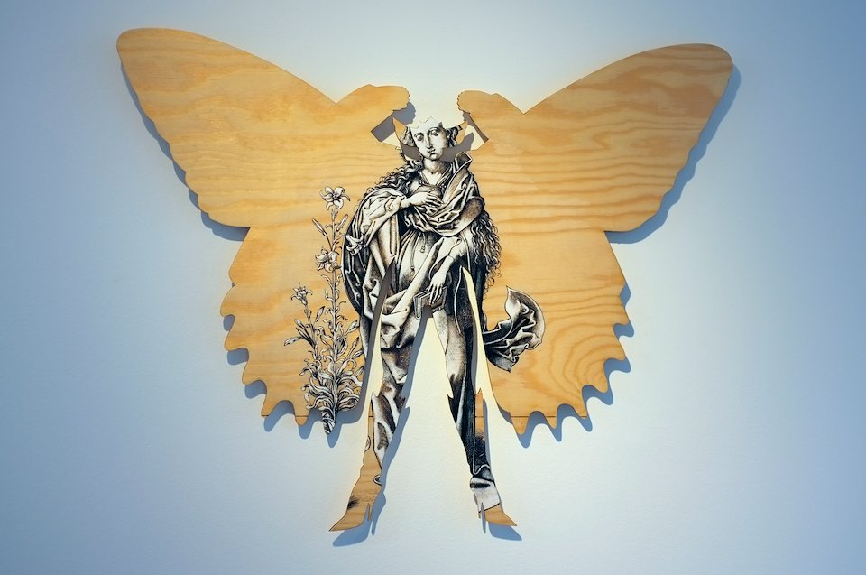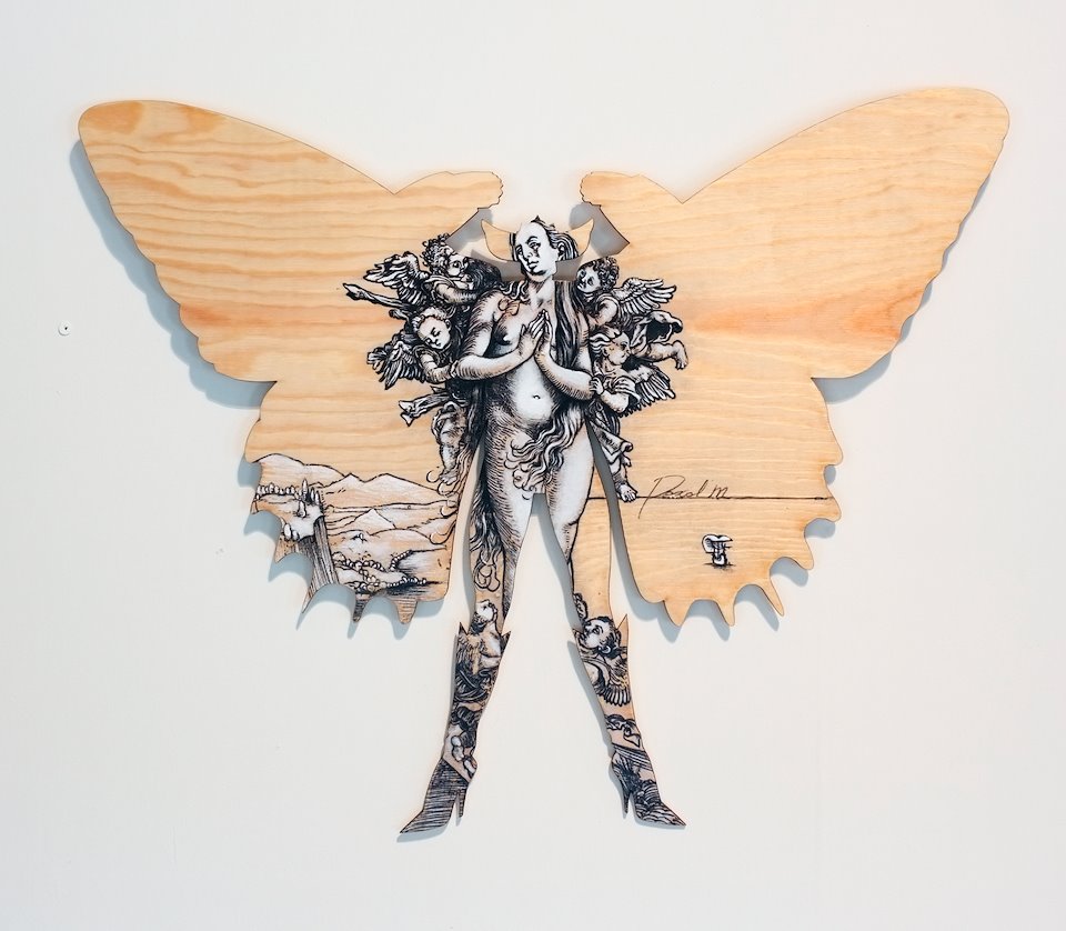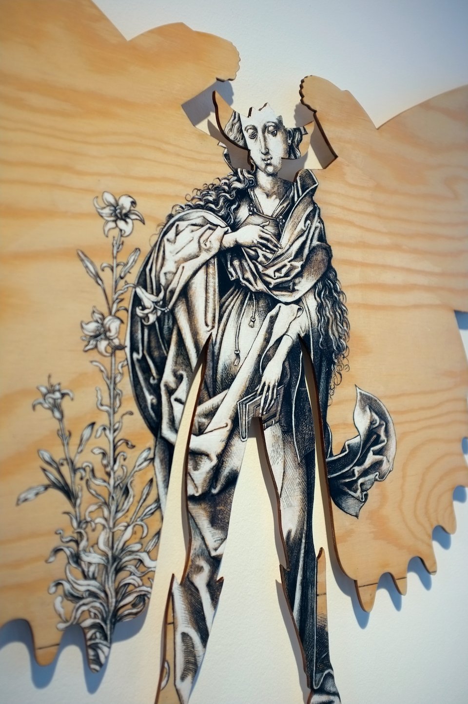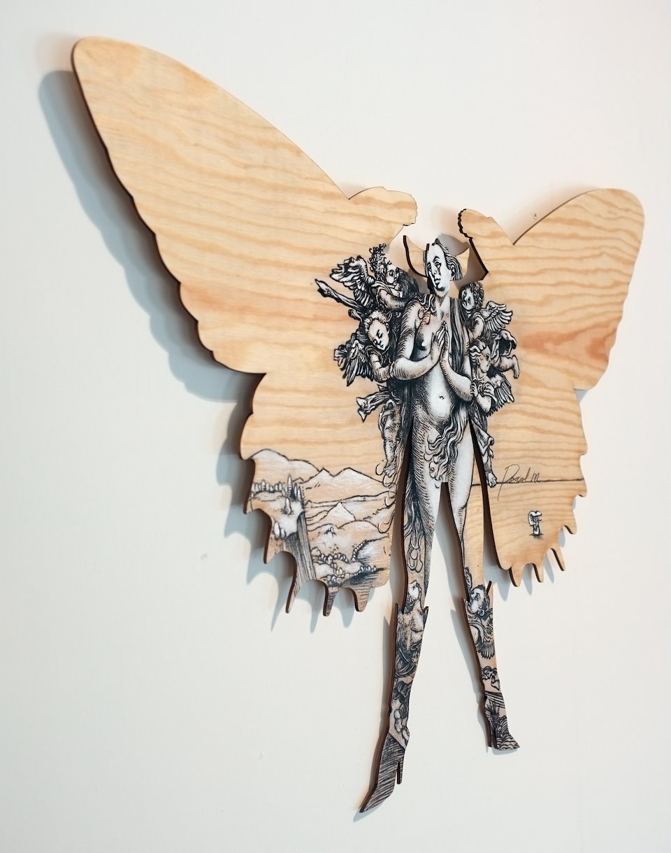 For that picture, I paint inspired by Martin Schongauer's engraving " The Virgin of the Annunciation " introduced into the body of a butterfly humanoid hybrid cut with a laser cutting machine.