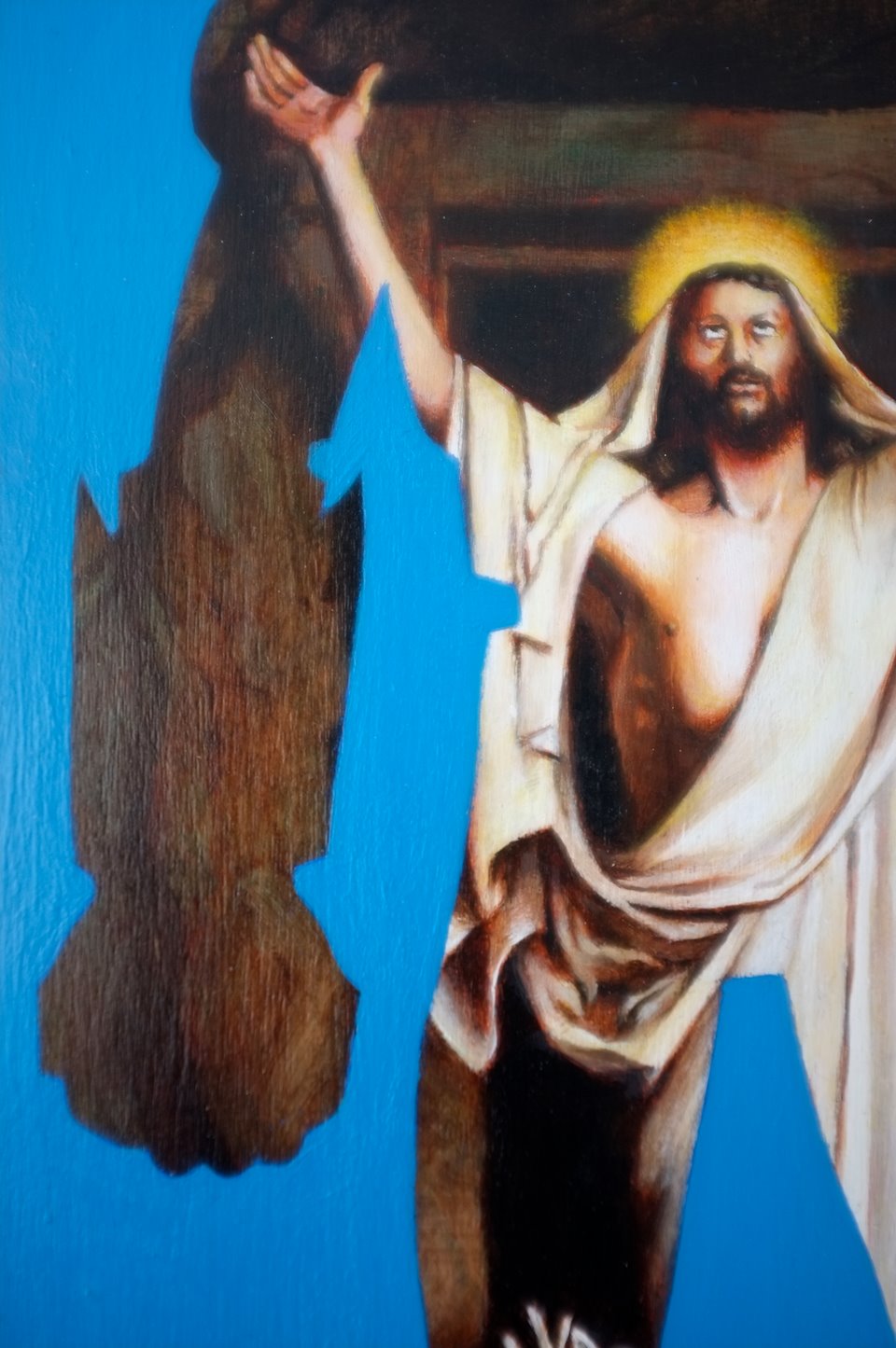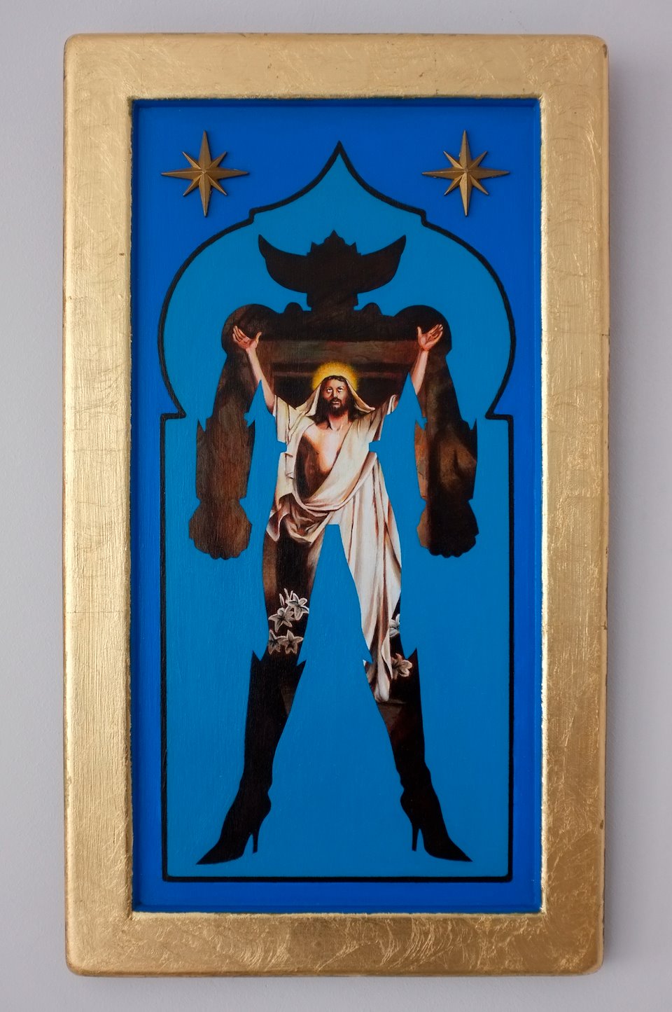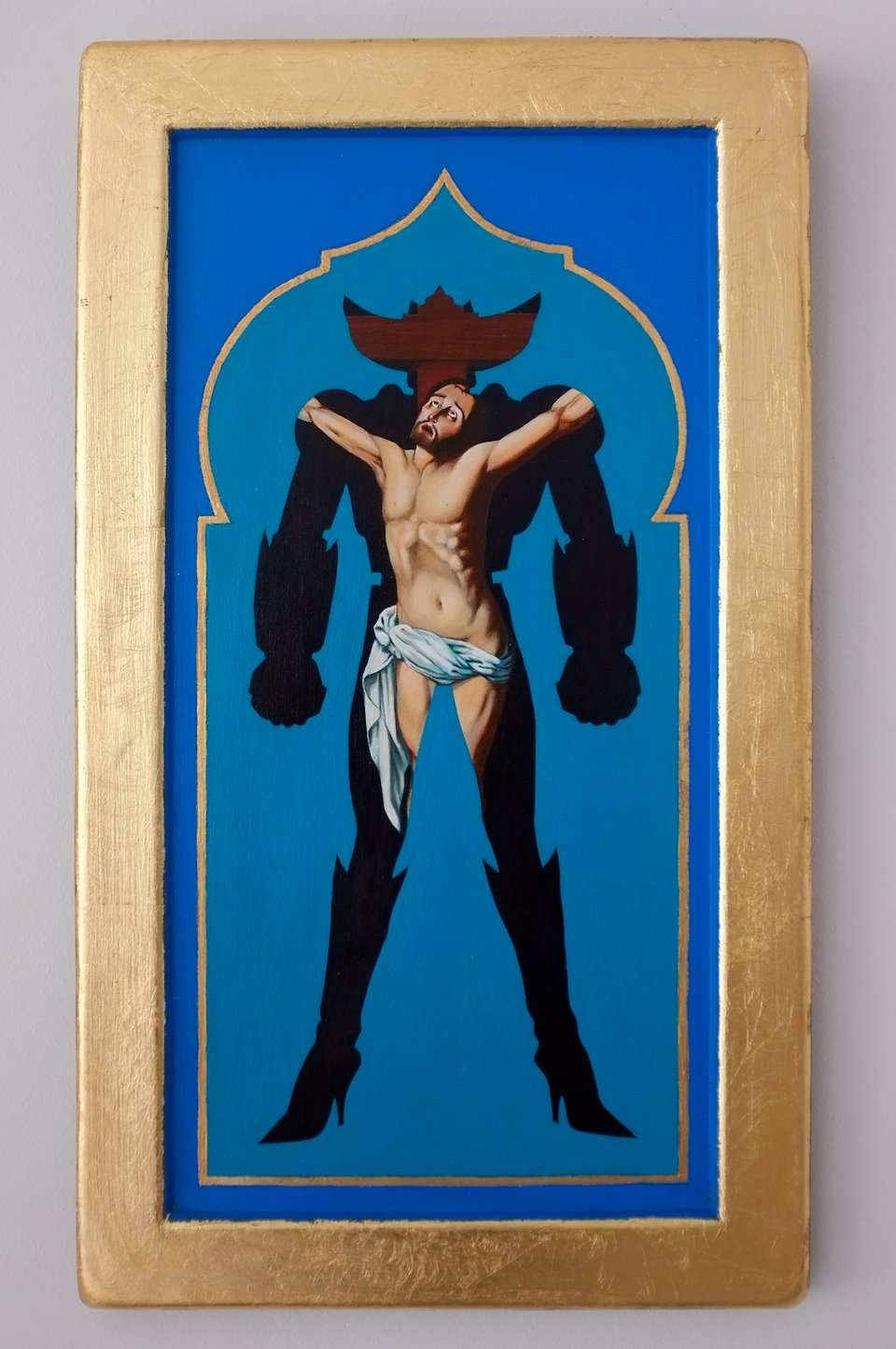 I paint inspired by Carl Heinrich Bloch's painting "Resurrection of Christ" introduced into the body of a humanoid hybrid. I work on wood prepared which I paint with acrylic and oil paint. I finish with gold leaf and a ring attached to the back which allows it to be hung.