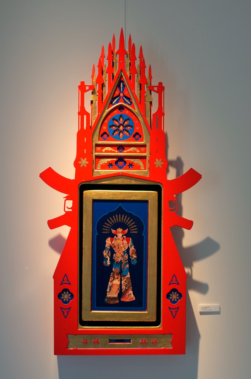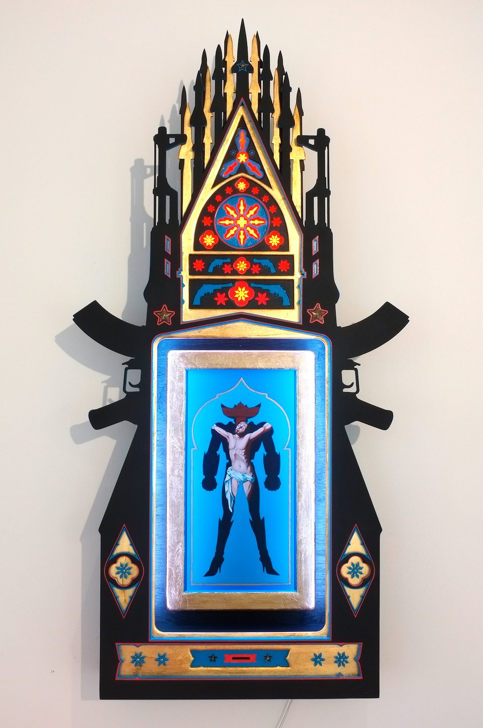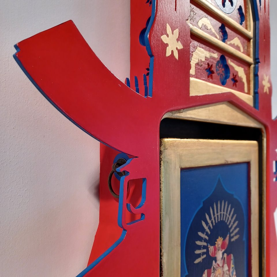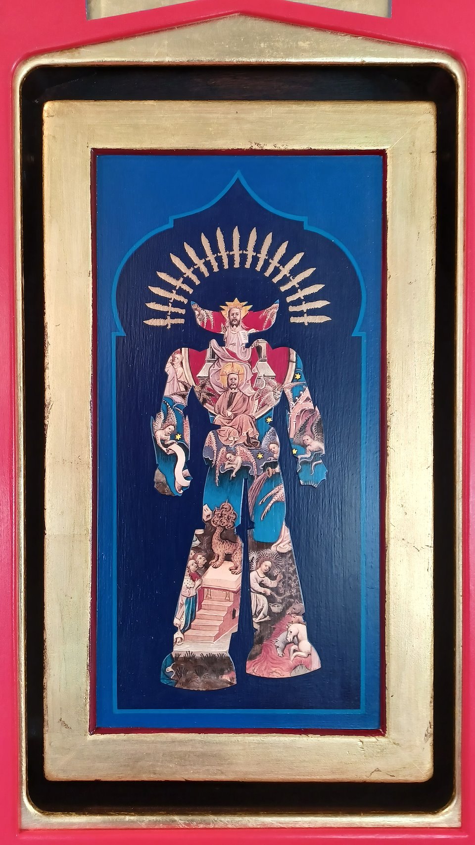 I paint inspired by Carl Heinrich Bloch's painting "Resurrection of Christ" introduced into the body of a humanoid hybrid. I work on wood prepared which I paint with acrylic and oil paint. I finish with gold leaf and a ring attached to the back which allows it to be hung.