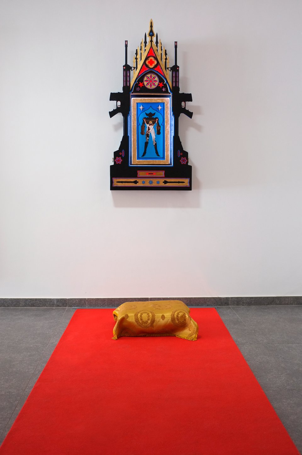The religious icon hangs without being permanently stucked.