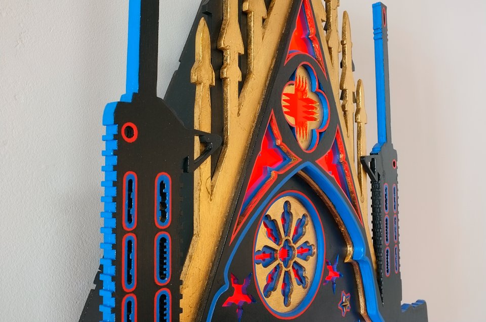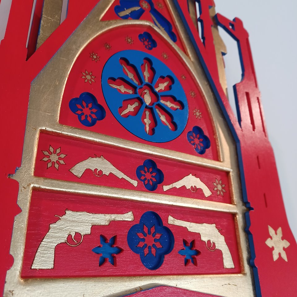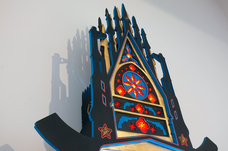 For the chapel, I use the laser cutting machine to cut the pieces of wood and Plexiglas. I assemble and sticked these different elements like a model kit. An interactive electrical system allows a play of light like a pinball when a coin is inserted into a money box.