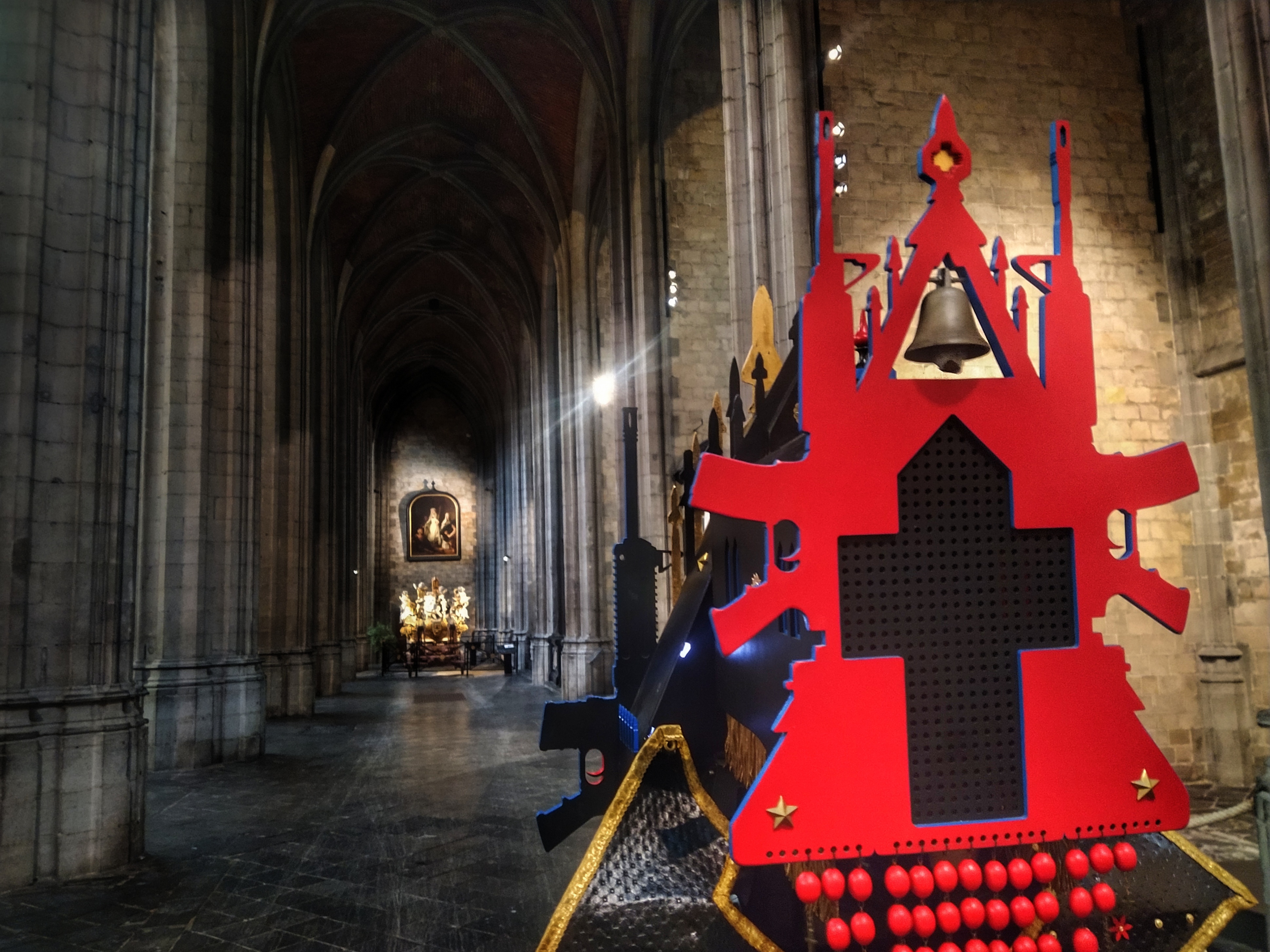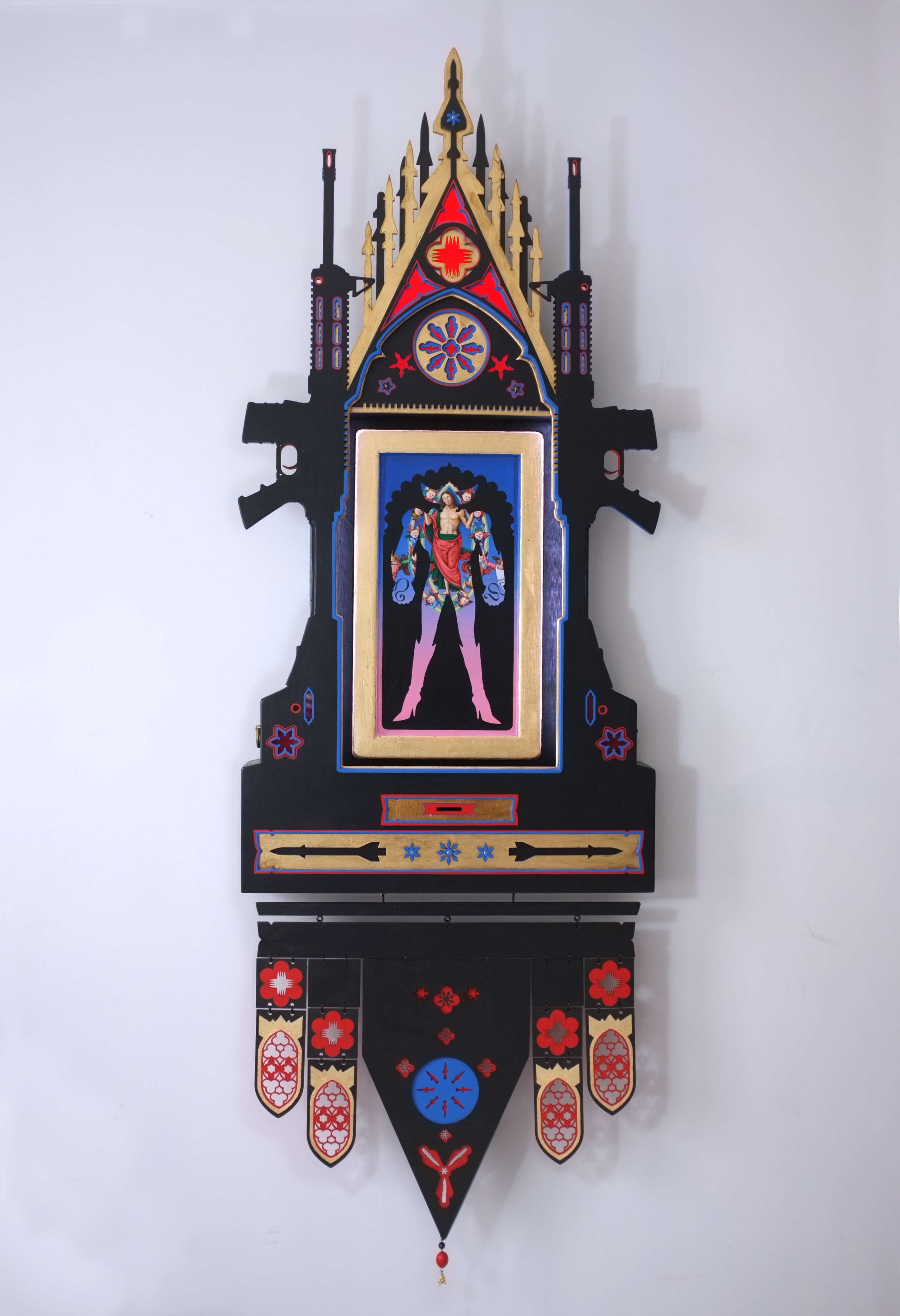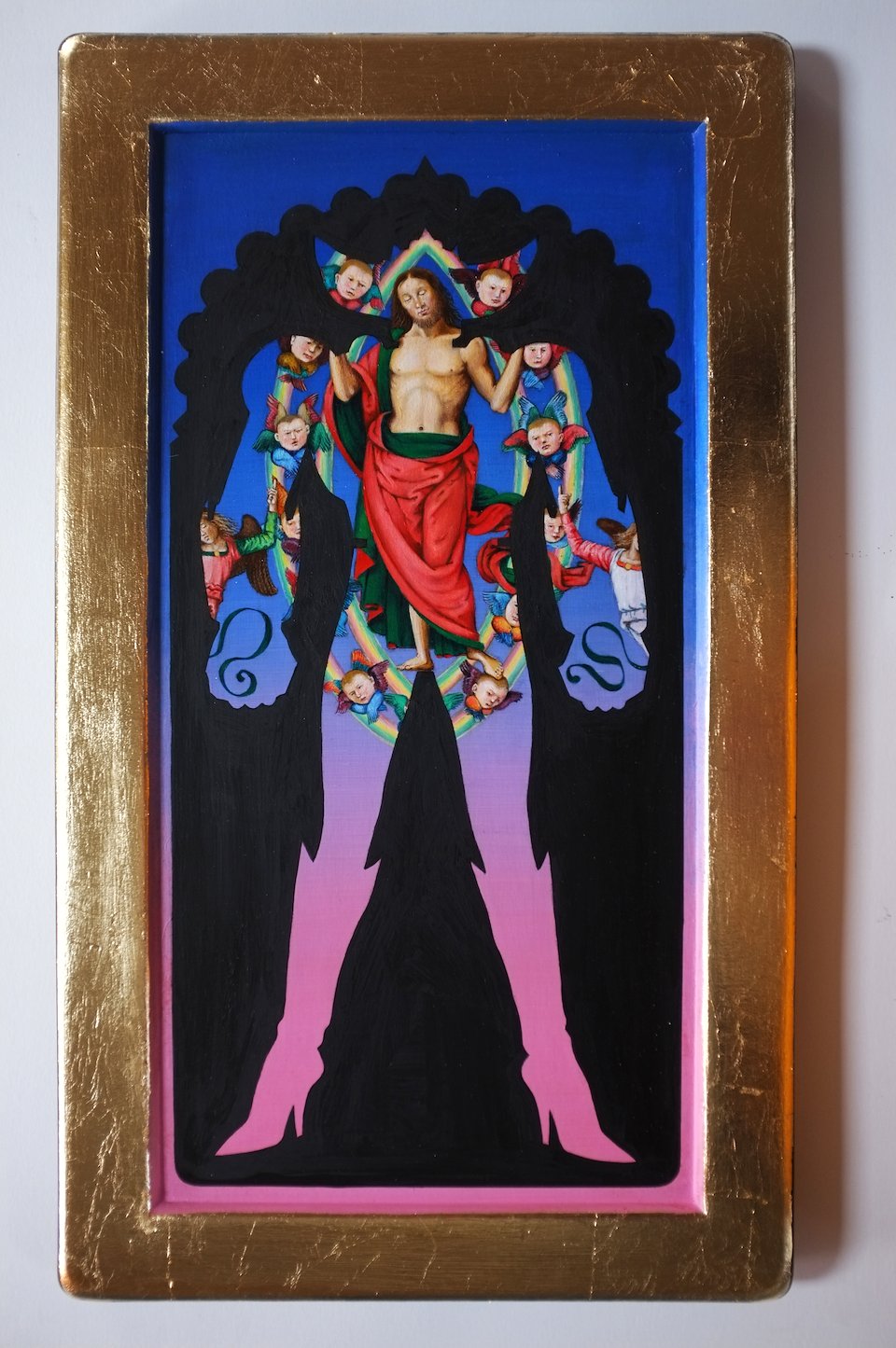 On its back, a chapel houses a painted image, using certain codes from the Orthodox icon. A painting representing a mixed-race figure, an interpretation of Perugino's painting "The Ascension of Christ" or Carl Bloch's "The Resurrection of Christ" integrated into a repurposed robot body.