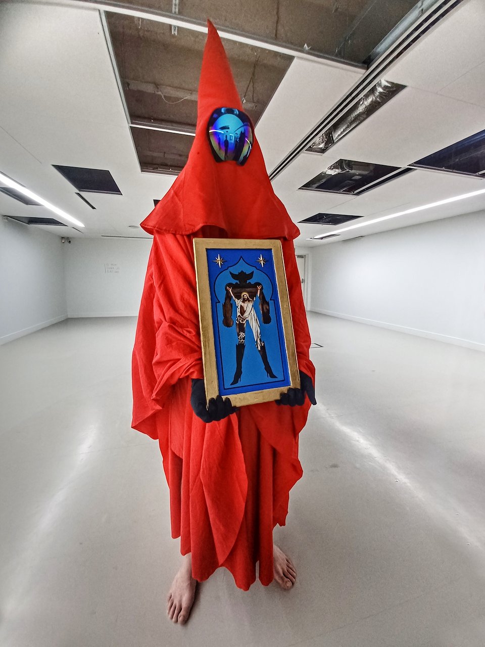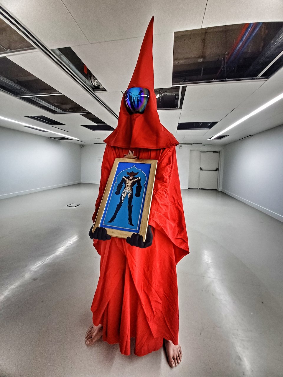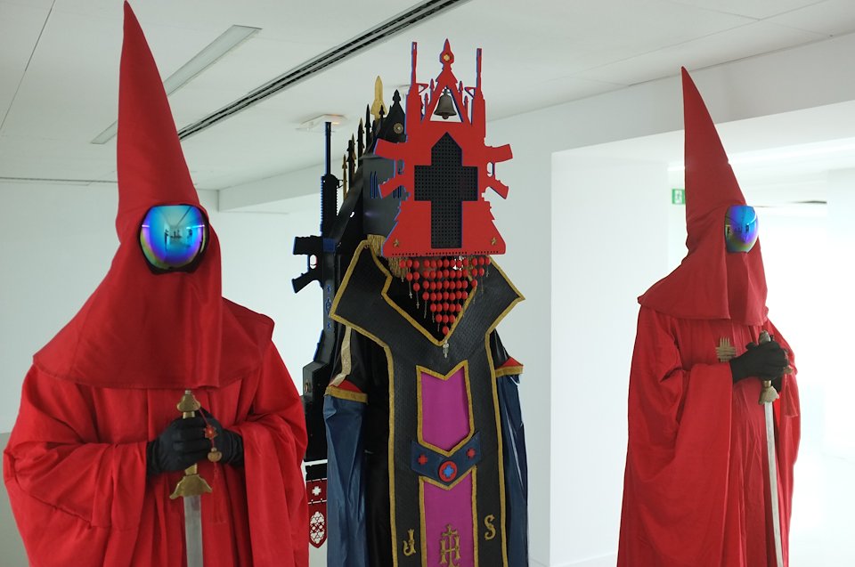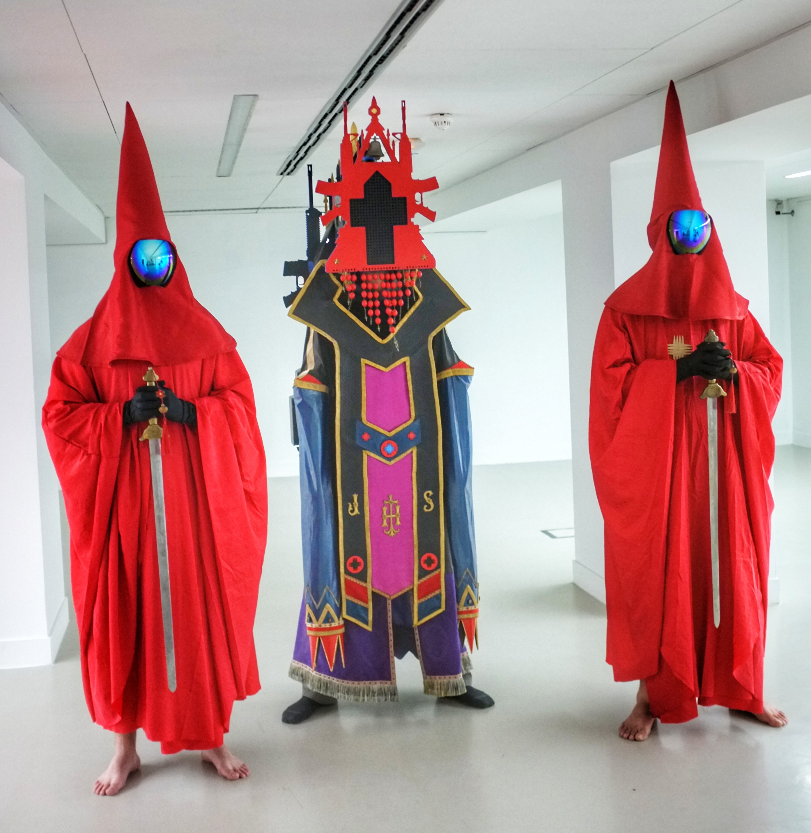 To add an interactive dimension, the stained-glass windows of this construction are animated by paid light shows, similar to a pinball machine. The costume gives the whole a living fetish image. The latticed face of his helmet, also in the shape of a chapel, is reminiscent of a confessional, like an oracle. Vodjo is an artistic entity capable of communicating, moving, and dancing to ward off evil spells.