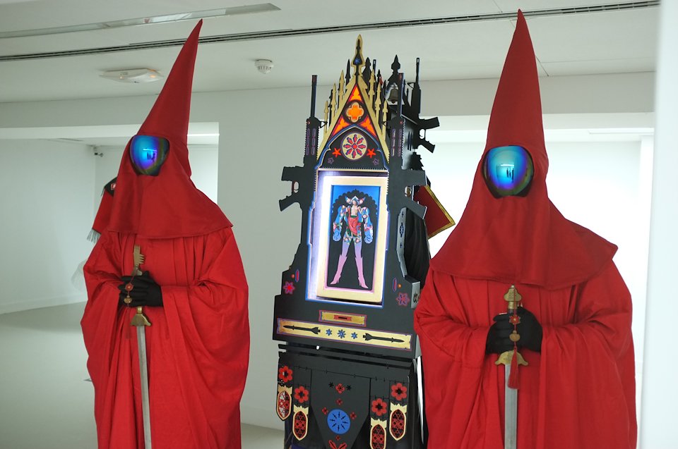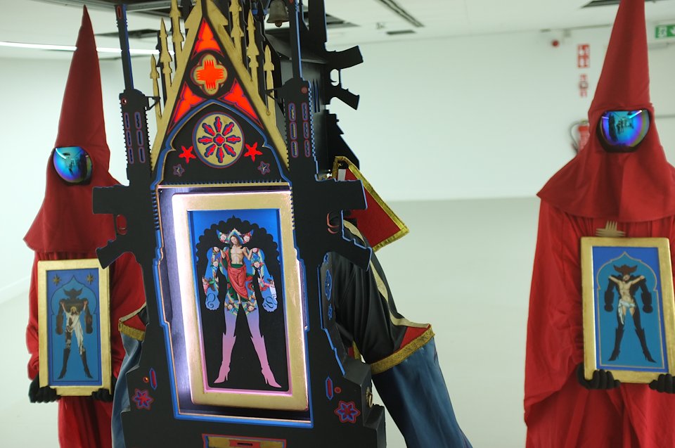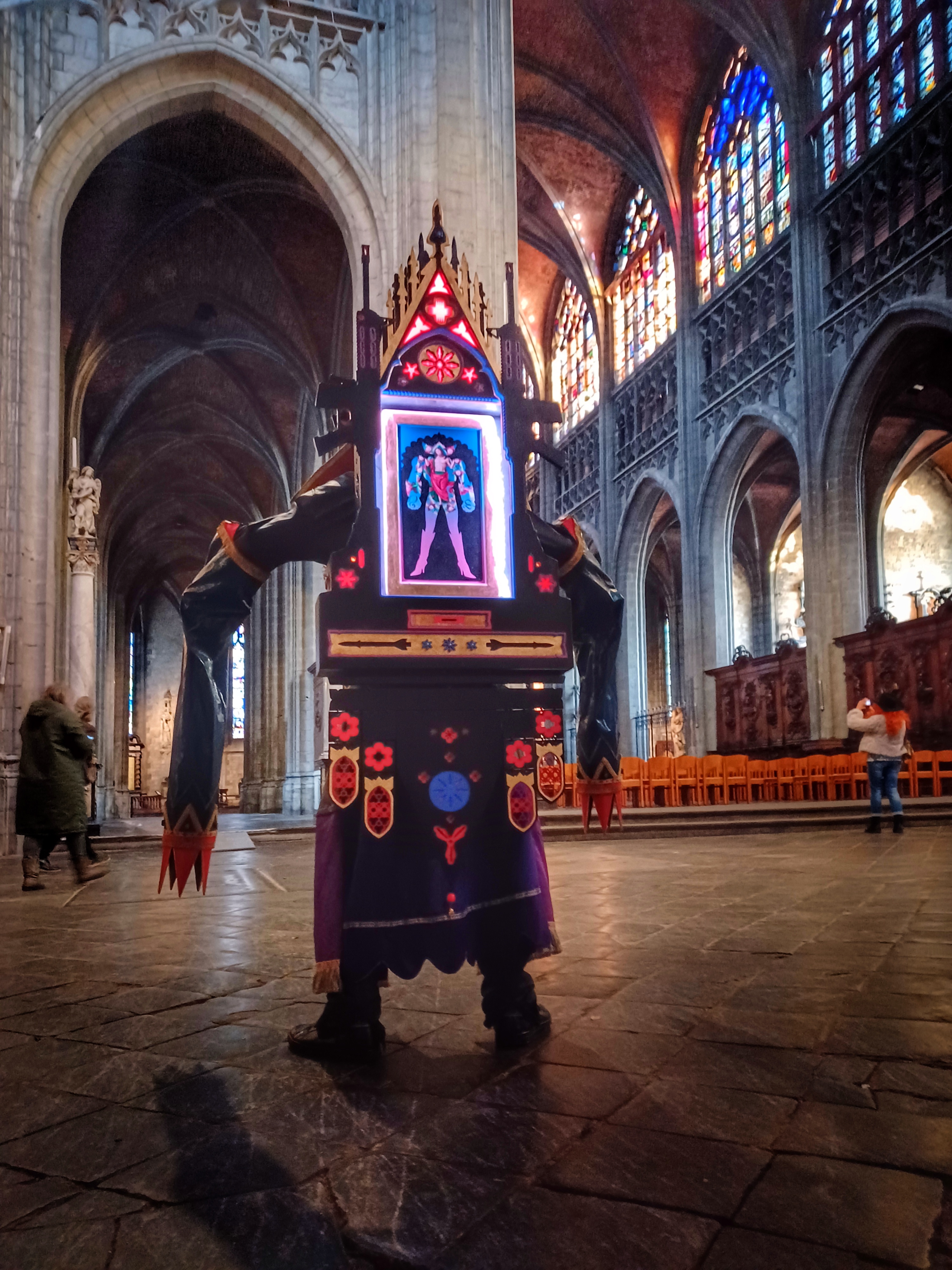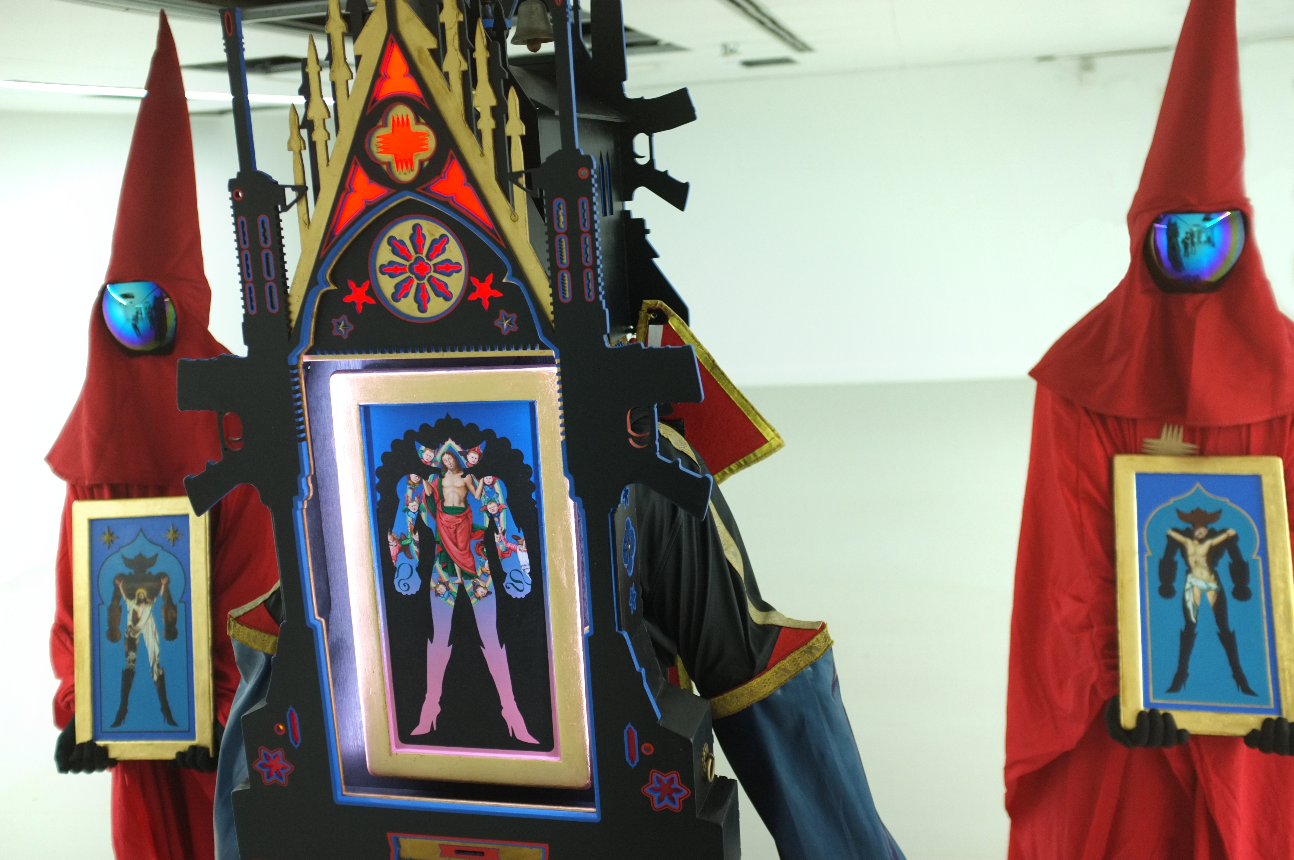 To add an interactive dimension, the stained-glass windows of this construction are animated by paid light shows, similar to a pinball machine. The costume gives the whole a living fetish image. The latticed face of his helmet, also in the shape of a chapel, is reminiscent of a confessional, like an oracle. Vodjo is an artistic entity capable of communicating, moving, and dancing to ward off evil spells.