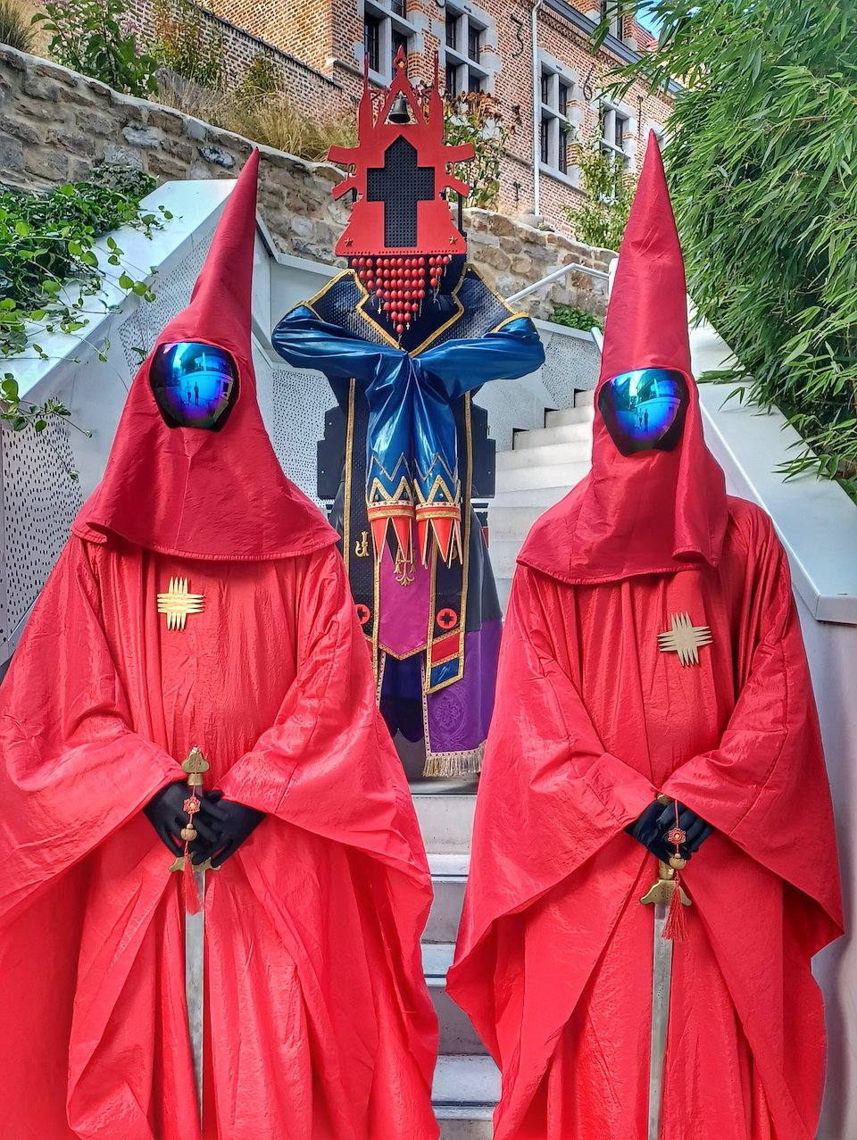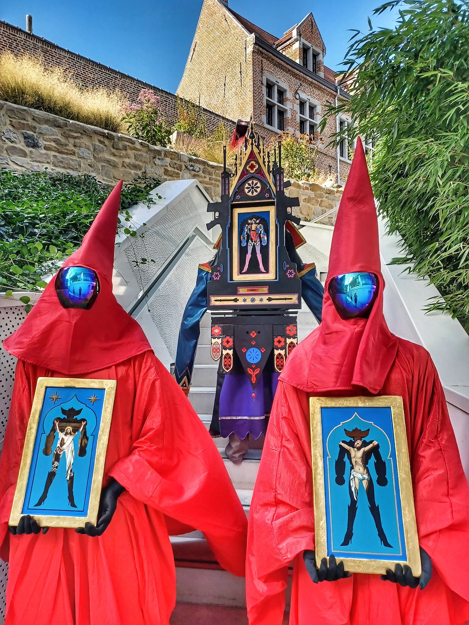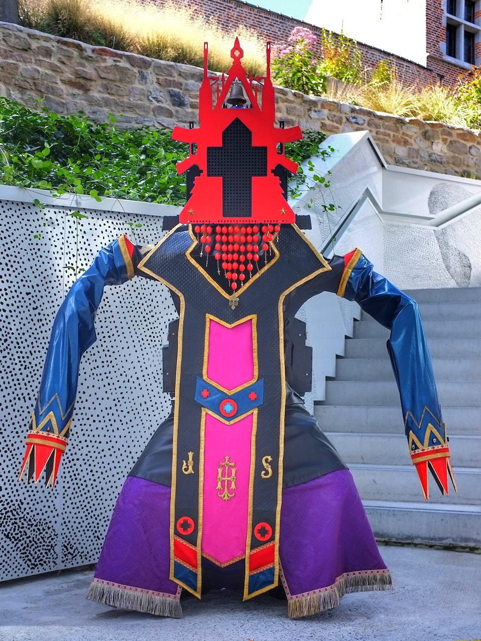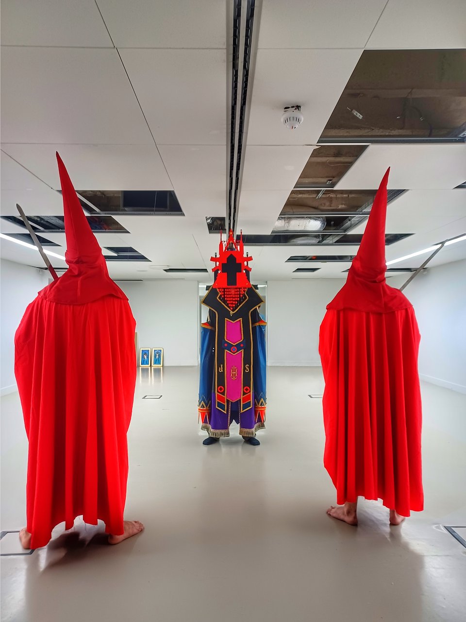 To add an interactive dimension, the stained-glass windows of this construction are animated by paid light shows, similar to a pinball machine. The costume gives the whole a living fetish image. The latticed face of his helmet, also in the shape of a chapel, is reminiscent of a confessional, like an oracle. Vodjo is an artistic entity capable of communicating, moving, and dancing to ward off evil spells.