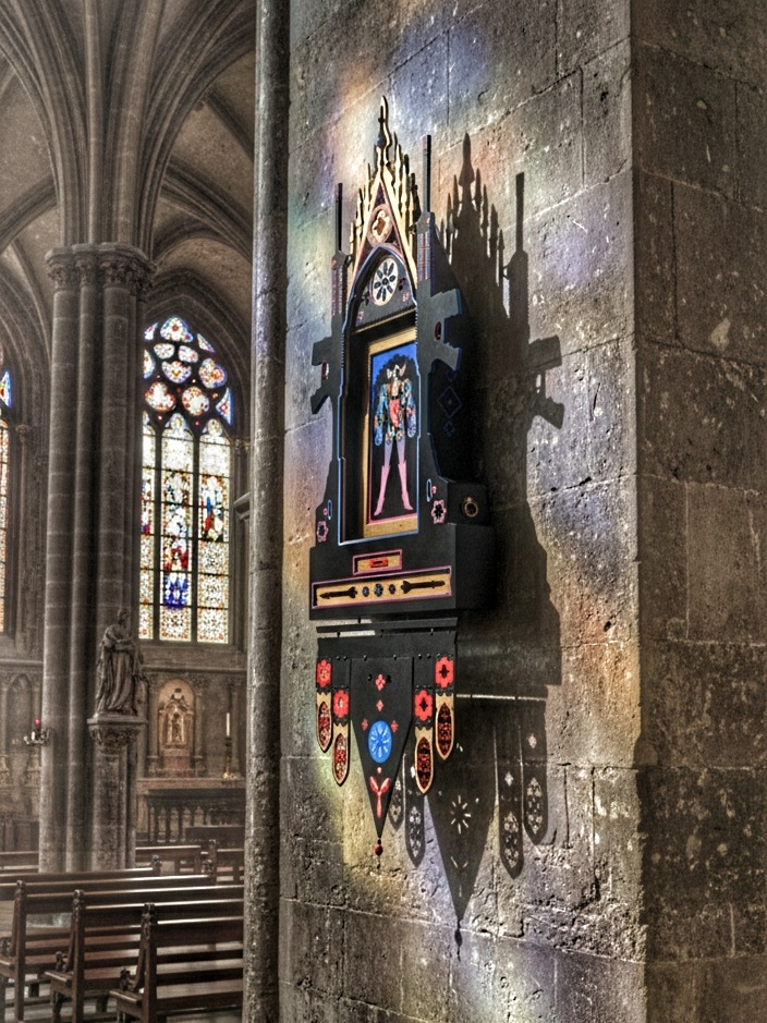 On its back, a chapel houses a painted image, using certain codes from the Orthodox icon. A painting representing a mixed-race figure, an interpretation of Perugino's painting "The Ascension of Christ" or Carl Bloch's "The Resurrection of Christ" integrated into a repurposed robot body.