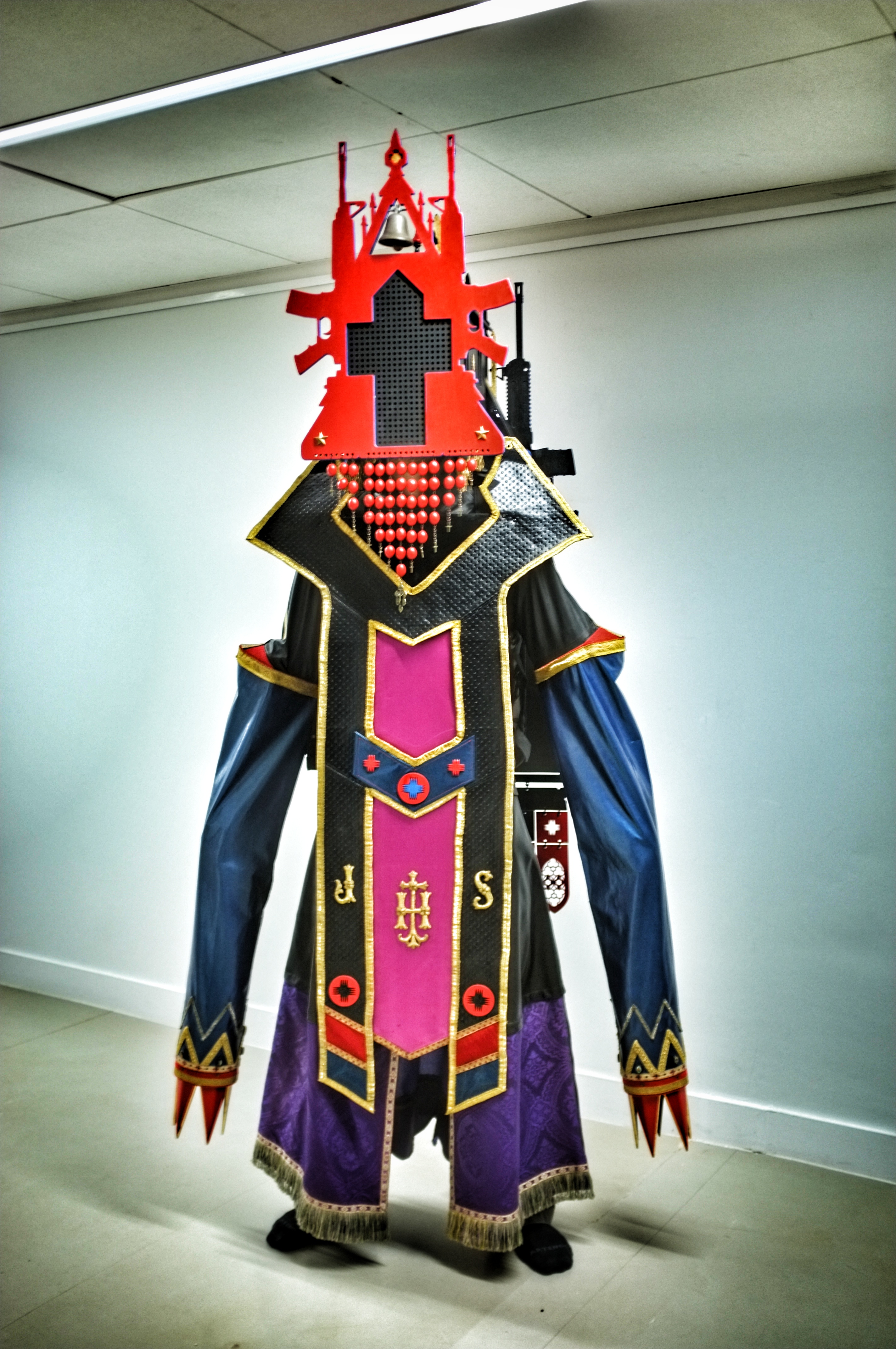 To add an interactive dimension, the stained-glass windows of this construction are animated by paid light shows, similar to a pinball machine. The costume gives the whole a living fetish image. The latticed face of his helmet, also in the shape of a chapel, is reminiscent of a confessional, like an oracle. Vodjo is an artistic entity capable of communicating, moving, and dancing to ward off evil spells.